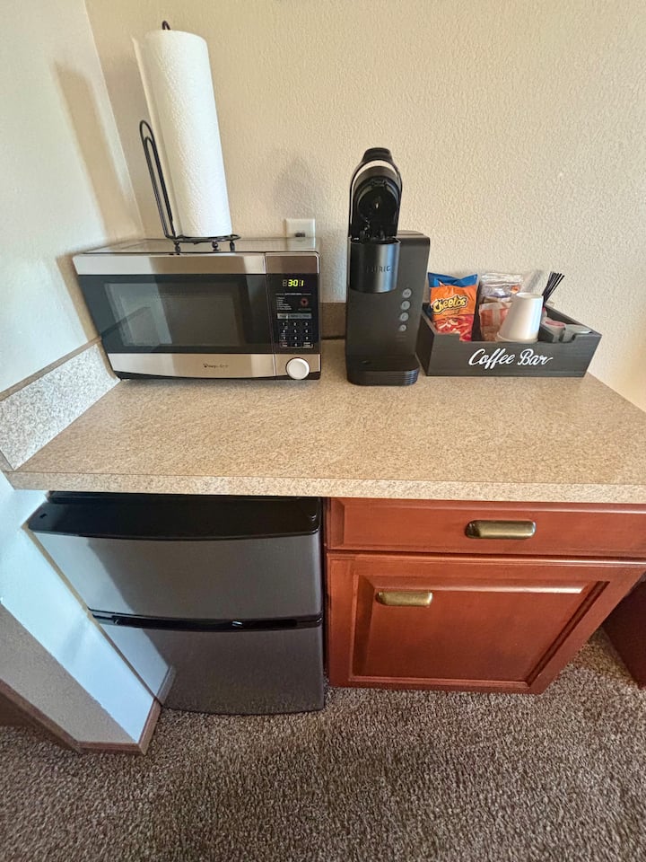 您可以使用房间内的所有便利设施,包括迷你冰箱、微波炉、咖啡机、书桌区和智能电视。