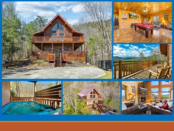 这间美丽的3卧/3卫木屋(可入住10人)距离餐厅、景点和活动场所仅几分钟路程。 我们的蒸汽热水浴缸、带台球桌的游戏室和每个房间的电视,让您在走进小屋的那一刻就开始放松。