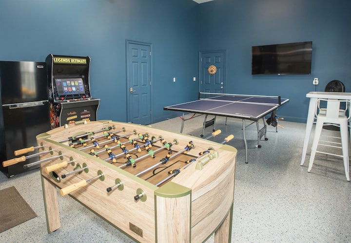 主楼层旁边还有一个游戏室。 在美好的日子里,打开车库门,呼吸新鲜空气,同时打乒乓球、桌上足球或在终极拱廊( 300场比赛)上玩游戏。 在大型平板智能电视上观看您最喜爱的运动队伍。 还有一张酒吧桌,可供观众或小吃休息。 车库里的冰箱/冰柜可以存放您的钓鱼渔获物! 这里有很多空间,可以与您喜爱的人一起留下美好回忆!