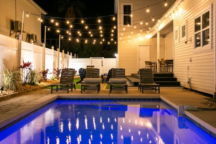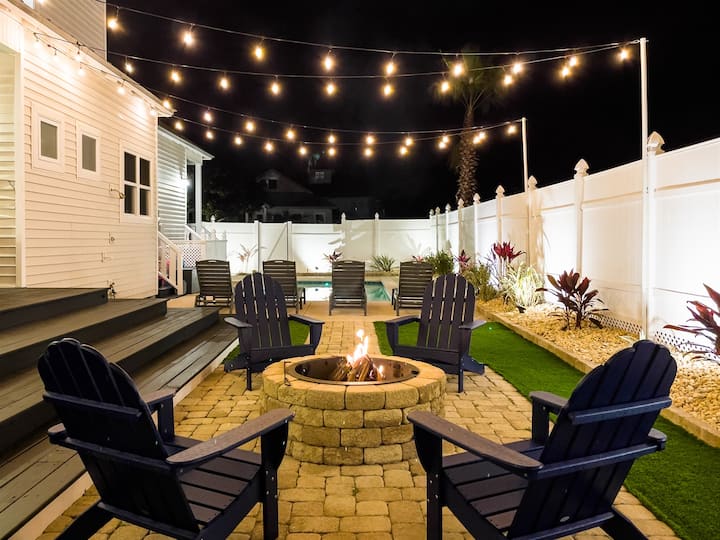 法式大门就在客厅外,打开门就是后院。 设有宽敞的私人泳池(可选收费供暖)、可爱的石头露台上的燃木火坑,周围环绕着Adirondack椅子、丙烷Weber烤架、舒适的躺椅,以及大露台上的两个独立用餐区,您可以在那里度过整个假期,完全满足。 头顶的串灯为房源营造出令人惊叹的夜间氛围,但无论白天还是夜晚,这里都有有趣而悠闲的氛围,让家人和朋友轻松重新建立联系。