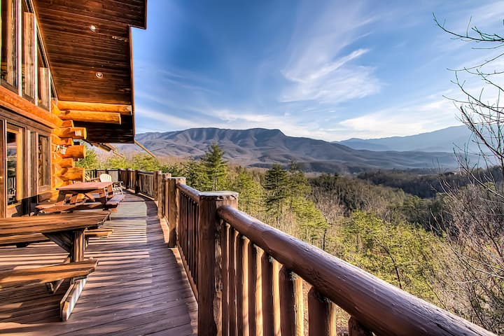 豪华、宽敞、私密、建筑令人惊叹的7卧室/7卧室小屋,由手工山原木制成,可欣赏令人难以置信的烟雾景观,占地超过5英亩,坐落在风景优美的皮特曼中心( Pittman Center )。 亲眼目睹大雾山最美的景色,随着天气和季节的变化而变化。 这间宽敞的小木屋内设有宽敞的开放式起居室,主楼层设有拱形天花板和裸露横梁,毗邻开放式厨房/餐厅。 这间小木屋的每间卧室都有自己的私人衣柜和浴室。 主层有2间卧室,阁楼层有2间卧室,下层有3间卧室,为每间5,261平方英尺的小木屋提供相当大的隐私和舒适性。 下层还有一间宽敞的大房间,可作为家庭/娱乐室。 这间布置精美的木屋位于每层,空间充裕,还有很多额外的存储空间。 开车前往该地区许多最著名的景点,包括加特林堡( Gatlinburg )、鸽子锻造( Pigeon Forge )等。 大烟山国家公园( Great Smoky Mountains National Park )非常近,有很多徒步道,开车前往纽波特的i40很方便,这是通往东加特林堡/皮特曼中心的交通量很少。 皮特曼中心( Pittman Center )是一个致力于保护其山区遗产的社区。 它在这个地区是独一无二的,为这间令人惊叹的小木屋增添了更具吸引力。