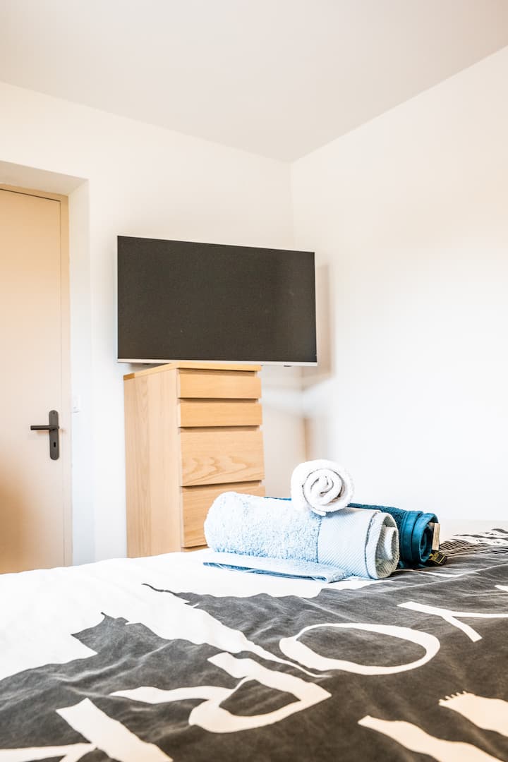 享受高清电视、带共用泳池的大型户外区域、安静的街区、免费无线网络和舒适的床( 1间带双人床的卧室、2间带单人床的卧室、带双人沙发床的客厅)。