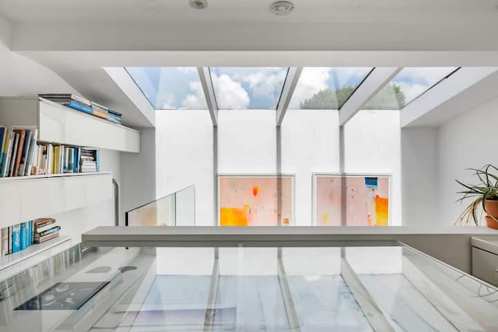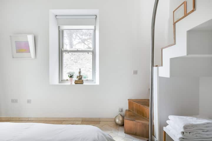 宽敞优雅,设有双层天花板和通往私人夹层的楼梯。 配备高品质床垫、鹅绒羽绒被和枕头(如果您有过敏症状,请告诉我,我可以更换这些)和高品质床上用品。 房间在夜间很漂亮,有着迷人的设计师照明层(酒店风格的双人床切换)石灰石地板和欢迎地暖。 楼上夹层的访客存储空间有限。