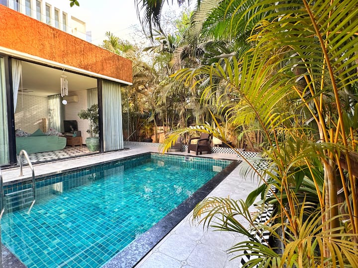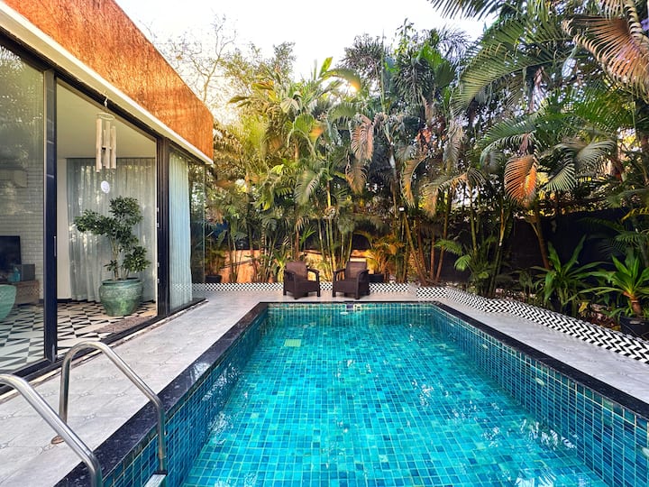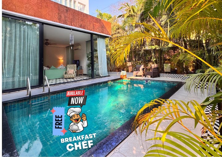 这栋宽敞的300平方米三卧室别墅位于瓦加托( Vagator ) ,距离北果阿( North Goa )著名的瓦加托( Vagator )海滩仅6分钟车程。 这栋别墅提供免费无线网络,🏖️配备65英寸平板电视、洗衣机、烘干机和设备齐全的厨房,配有烤箱和微波炉。 这栋豪华的全新别墅拥有一流的设计师配件、大型落地窗、主卧室设有设计师浴缸、带按摩浴缸的屋顶露台、大型游泳池和别墅的独立入口。