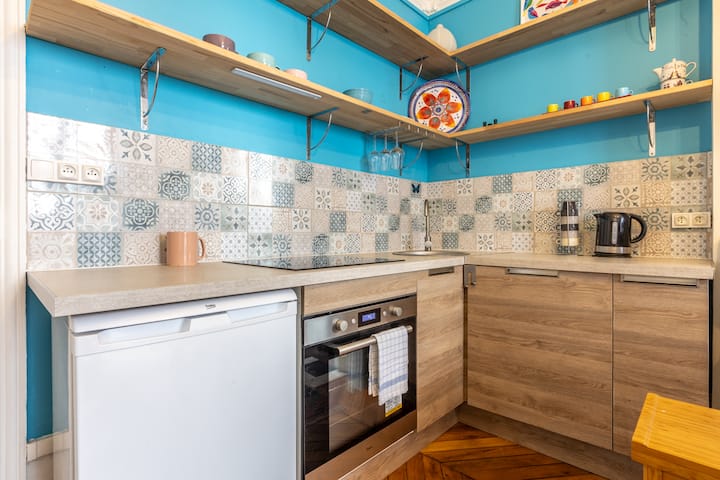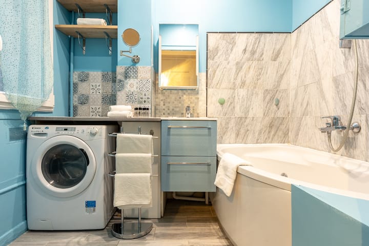 这套可爱的45平方米的公寓设有舒适的起居室、舒适的沙发床和电视屏幕,让您放松身心。 入住期间,您可以使用大餐桌与家人或朋友共进晚餐。
