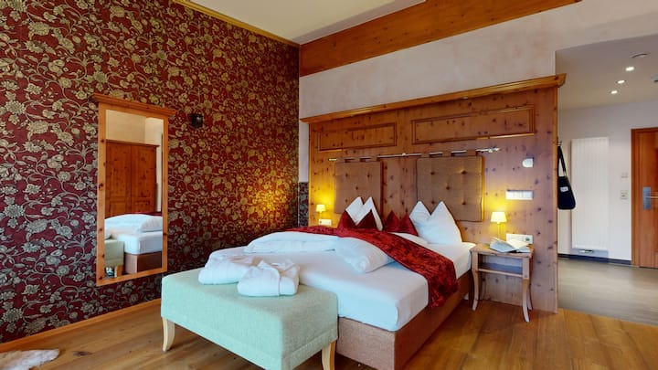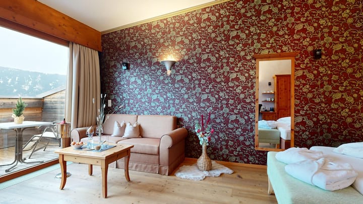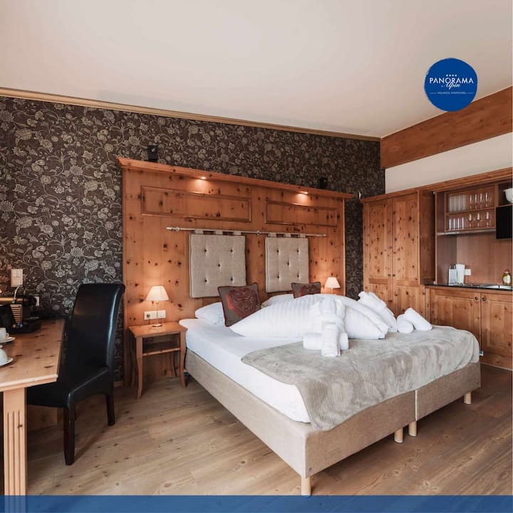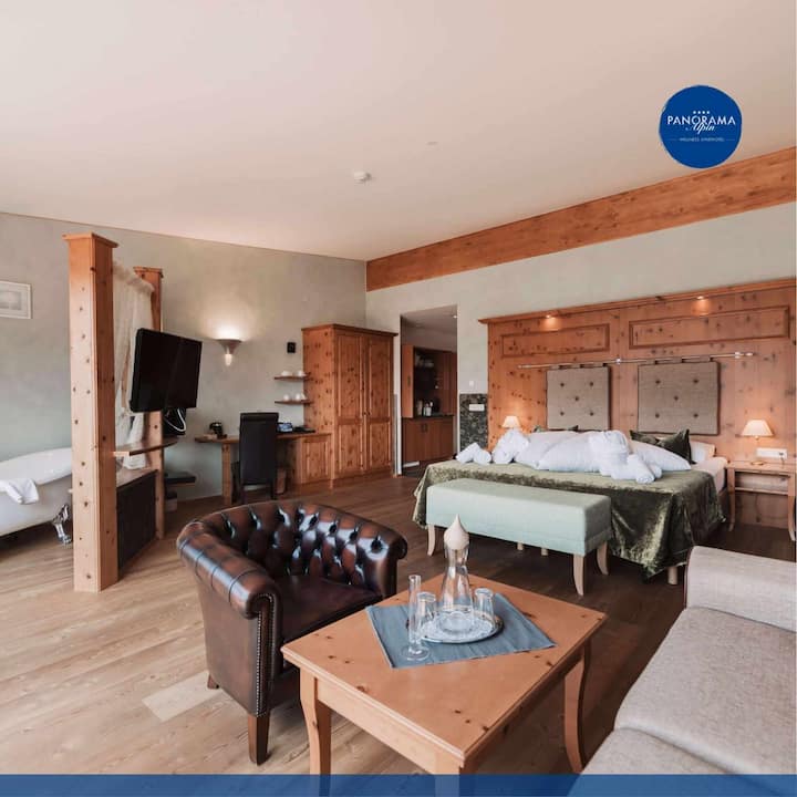 这套 50 平方米的公寓非常棒,配备双人床、起居/用餐区域和沙发床,可供 2 位成人和 2 位儿童入住。 享受独立式浴缸,欣赏令人惊叹的全景,并使用私人桑拿房放松身心。 设备齐全的 Miele 厨房、配备淋浴设施的现代化卫生间、马桶、吹风机和天然洗漱用品。 大型全景窗户、无线网络、平板电视、保险箱、木地板和朝西的露台,让您尽情享受山间世界。 非常适合浪漫之旅或难忘的家庭时光。