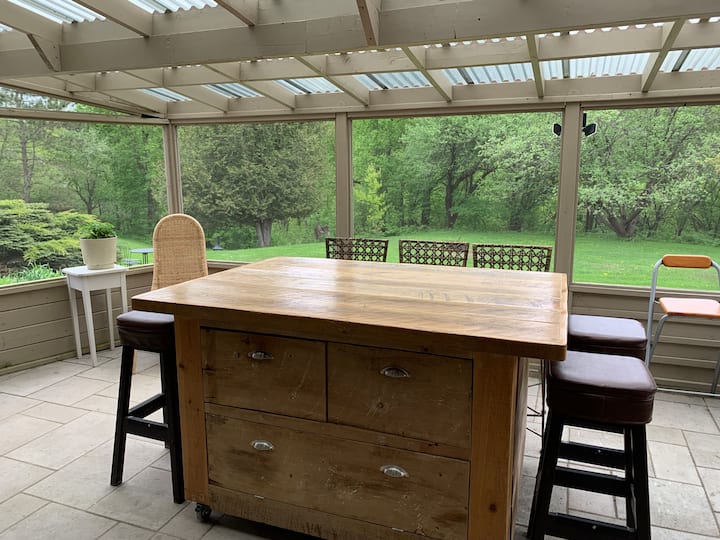 想要在不放弃现代舒适的情况下,穿越时空,回到过去吗? 欢迎来到真正的20世纪50年代工匠之家,经过精心修复,融合了复古魅力、现代舒适和包络的氛围。 这是劳伦森地区的罕见之地,坐落在绿色环境中,非常适合家庭度假、朋友聚会或独特的庆祝活动。抵达后,您会看到两百年历史的枫树林立的雄伟U形入口,为您的旅程定下基调。 在这里,每个角落都讲述着一个故事:秘密角落、温馨的氛围和木材的自然温暖。