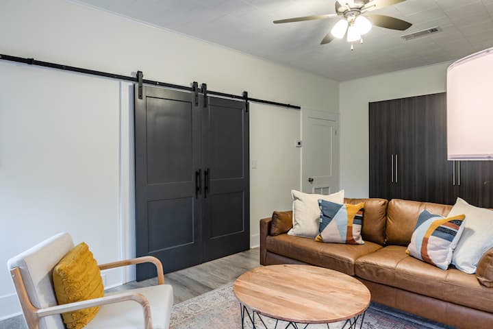 * * *卫生间位于第一间卧室内。 这栋房子采用「猎枪风格」。 您必须穿过第一间卧室才能到达第二间卧室。 第一间卧室不会有很多隐私,因此请确保您与其他旅行者相处超级舒适:)。 有梳妆台和定制瓷砖淋浴间。 该房源没有浴缸。 卫生间的谷仓门从里面锁上。 我们提供洗发水、沐浴露和吹风机。 提供毛巾和毛巾。 房源内没有洗衣机/烘干机。