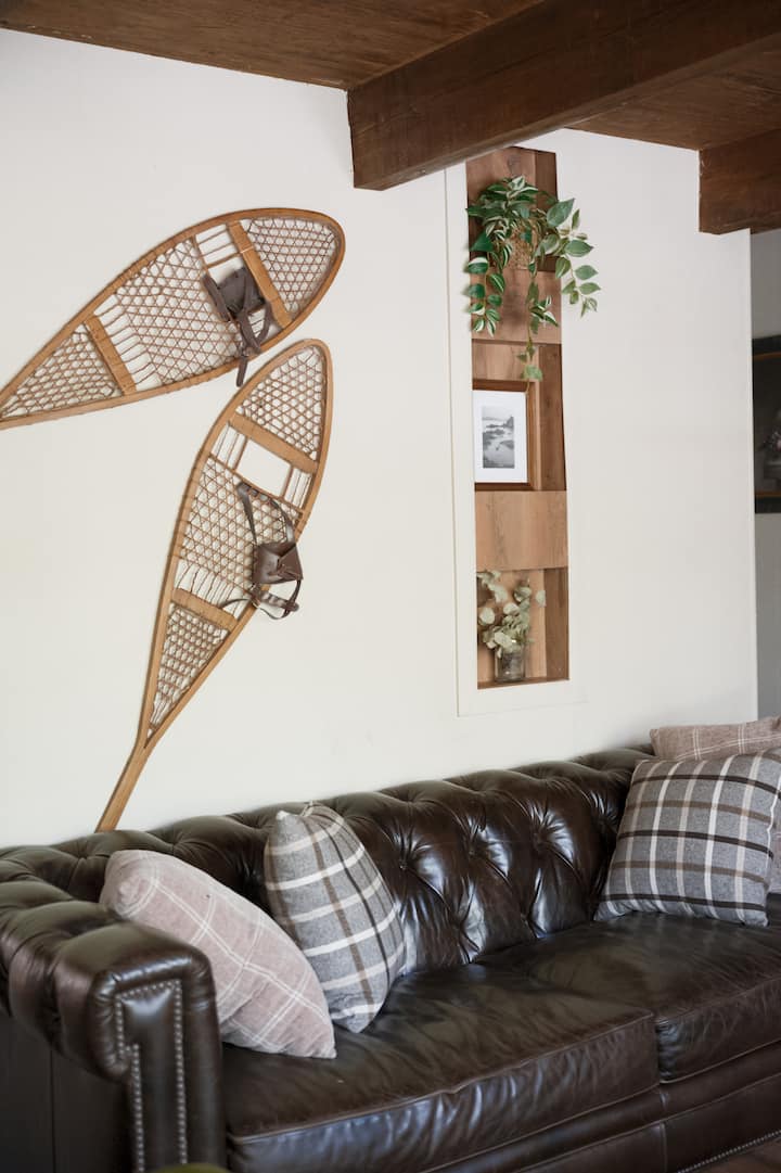 村庄附近的设计师小屋、雪地轮胎、滑雪