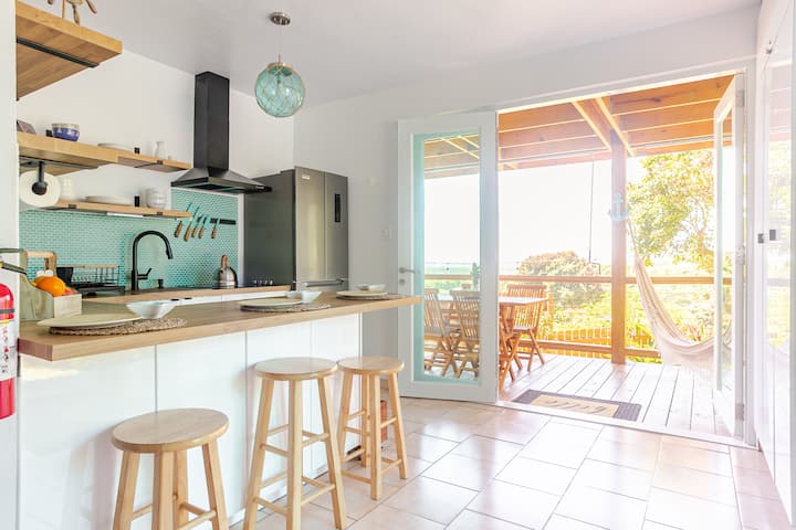在这个宁静的住处,与全家人一起放松身心。 小山丘上的安静街区,景观非常好。 您会被这片远离日常喧嚣的天堂迷住。 Ocean Eyes将自然、景观和起居区无缝融合,通过厨房和美丽的露台连接起来。