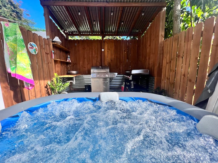露台上有一张吊床和一张餐桌。 Ocean Eyes最好的终极设施是私人热水浴缸和烧烤区。