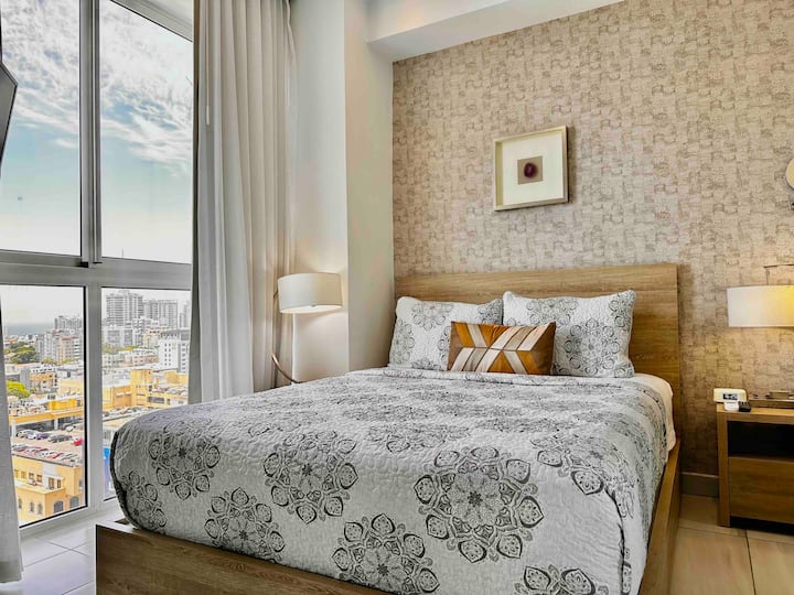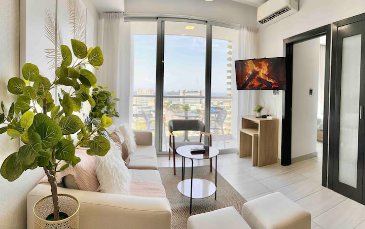 舒适的市中心公寓,配备泳池、健身房,可欣赏迷人的城市景观。