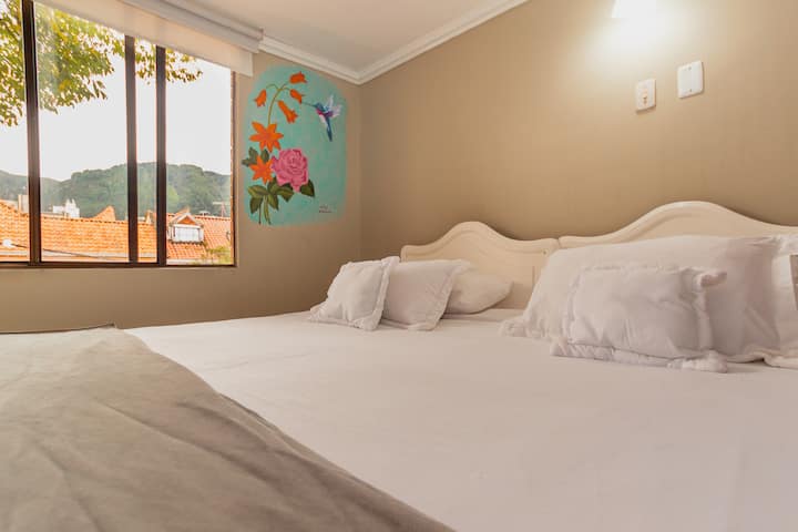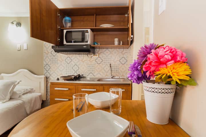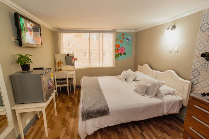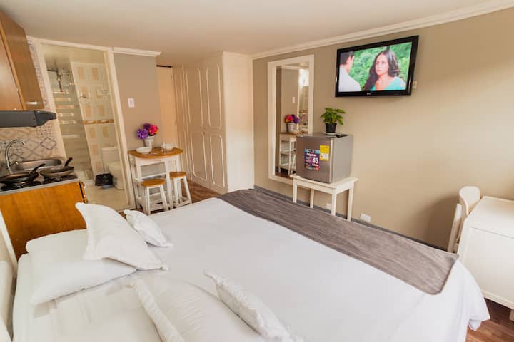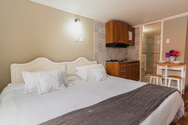 公寓式单间公寓,适合2人入住,新冠肺炎疫情规程19、高速床加大双人床、高速无线网络、停车和共享工作。 位于CHAPINERO街区附近的TEUSAQUILLO街区,是一个标志性的中心地区,可轻松前往剧院、公共交通、文化中心、长廊、公园、博物馆、餐厅。 非常适合情侣、家庭和/或独自探险,从中心安全的地方出发。 ¡清洁、空间消毒和24小时前台标准