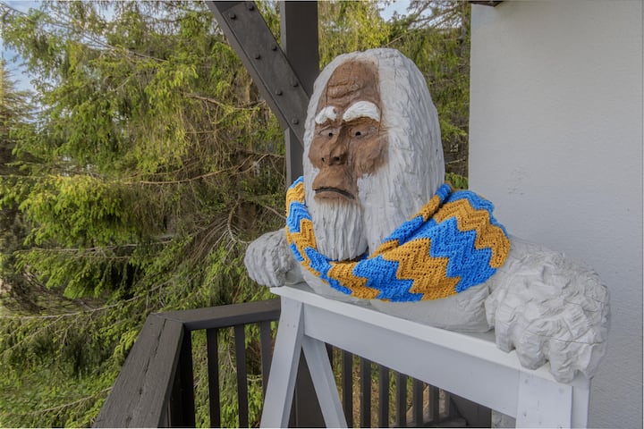 在客厅外,您可以在甲板上(有您自己的大脚怪! ) ,在那里您可以观看滑雪者或下坡山地自行车手,放松身心,手边有您最喜爱的饮料!
