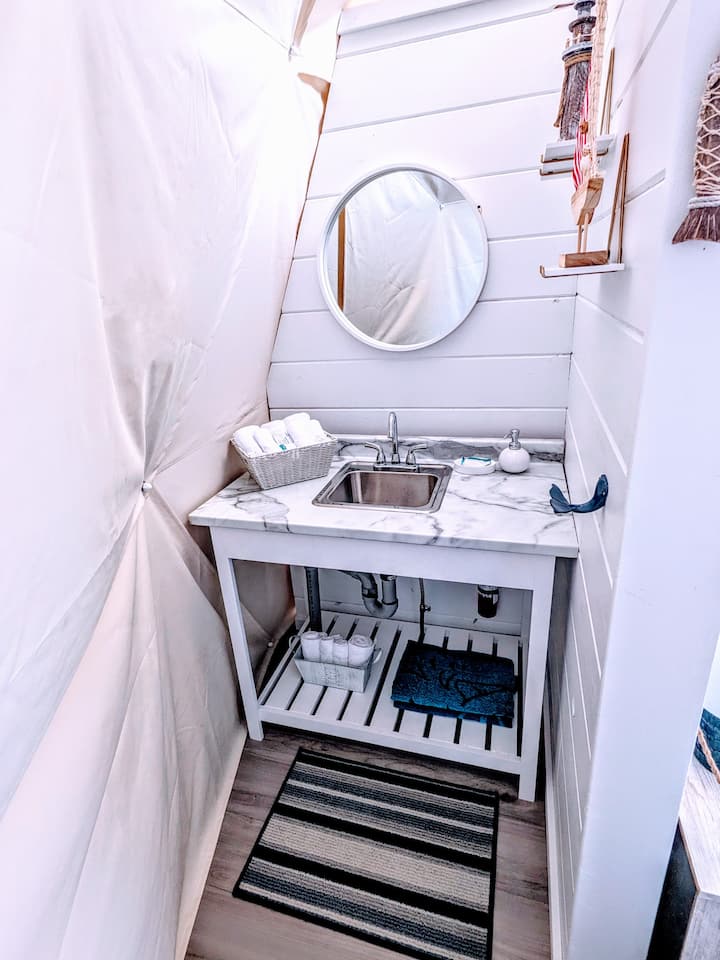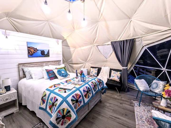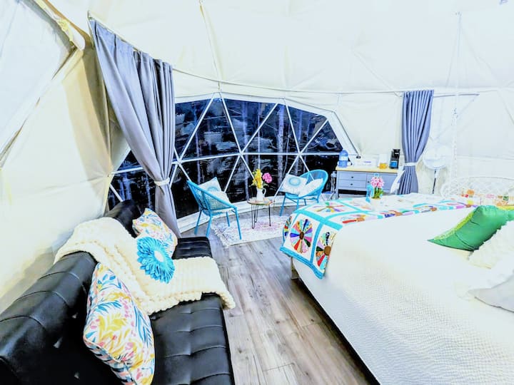 请记住,您在我们的圆顶上的住宿是一种「豪华露营」体验。 这些地球穹顶实质上是绝缘的帐篷,有通风口,但它们不像您在家中习惯的那样控制温度。 请务必多带几层衣服,以适应较低的温度,在炎热的晴天打开通风口并拉上窗帘可以帮助冷却圆顶。 然而,我们的便携式空调/暖气装置非常好,使我们的穹顶相当舒适。 当门关闭时,此装置效果最佳,这也有助于防止不必要的昆虫进入。为了在我们的圆顶内更加舒适,别忘了带上您最喜欢的舒适拖鞋!房客应注意,这些圆顶屋未配备浴缸或淋浴间,因为我们希望模仿实际的露营体验。只需打包好食物、个人洗漱用品和衣服,其他的我们都有。