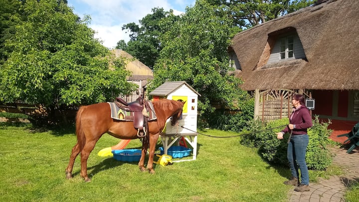 Wegkaten是一个长长的茅草屋顶,是文件中第一次提到的1780年。此外,我还提供一个美丽的花园,位于森林中。距离波罗的海及其白色海滩仅25公里。每天提供复活节骑行和品酒课程