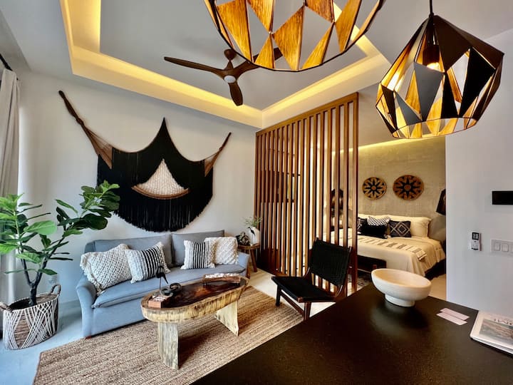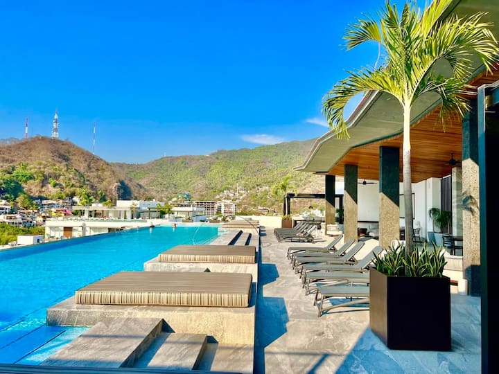 我们的豪华单间公寓采用迷人的波西米亚风格装饰,让您尽享奢华的度假体验。 配备豪华加大双人床和多功能拉伸沙发,精心设计,可最大限度地扩大空间,同时不影响优雅。 透过宽敞的窗户,您可以欣赏到巴亚尔塔港(Puerto Vallarta)壮丽的山脉,让自己沉浸在私人天堂中,同时尽情享受大自然的美景。 这套单间公寓设有设备齐全的厨房和豪华的三件套卫生间,均采用高端装修,确保每个细节都能提升您的住宿体验。 Parota 木质装饰与波西米亚风情完美融合,营造出轻松精致的氛围。 配备最新智能电视技术和Alexa音箱,将时尚与现代便利完美融合,带给您娱乐和联系的便利。