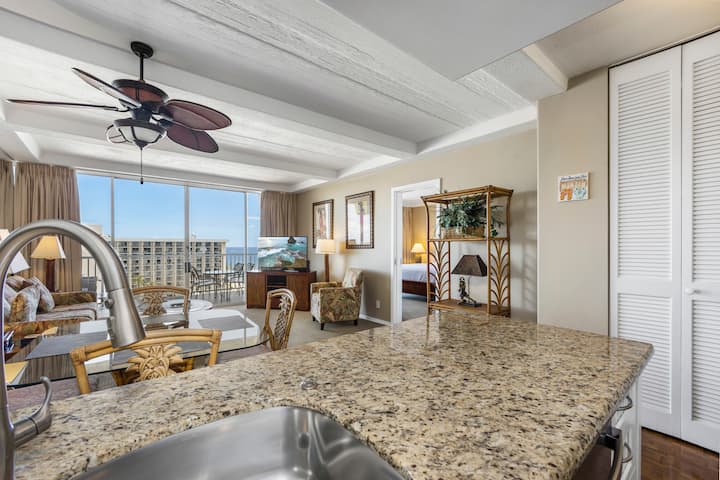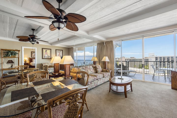 这座温馨舒适的海景公寓位于卡纳帕利海滩( Kaanapali Beach )。 家具的温暖色调和自然阳光为您和亲友创造了完美的家外之家。 这套公寓也面向中心,因此您可以欣赏到维护良好的华丽房源和太平洋地平线的最佳景观。