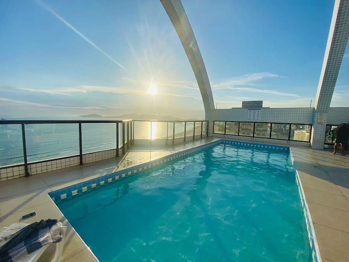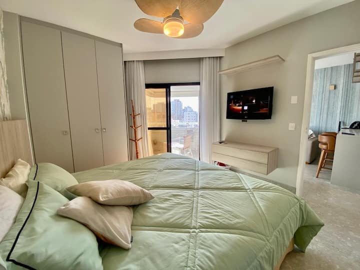 巴西超赞房东为您呈现这间宽敞的海滨公寓,可欣赏令人难以置信的海景。 房源提供清洁服务、周末海滩帐篷、无线网络、游泳池和全景健身房。 套房配备一张加大双人床,客厅和卧室均配备空调。 最多可供4人入住。