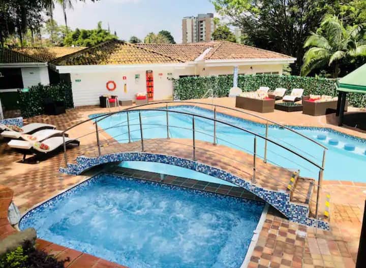 El Poblado 12卧室热带豪宅,距离Parque Lleras/Provenza 5分钟。 每间套房均配备加大双人床、独立卫生间、空调、智能电视和保险箱。 享受私人度假村风格的泳池,配备18人加热按摩浴缸、泳池吧台、瀑布、烧烤、阳光躺椅和户外用餐。 在配备酒吧、灯光、音响和空调的私人夜总会娱乐。郁郁葱葱的门禁大院,配有热带花园、24小时安保和管家。 包括桑拿房、蒸汽浴室、台球、飞镖,非常适合寻求隐私、便利、无障碍。