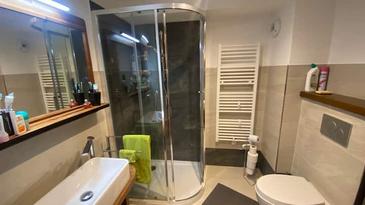 复式卫生间:带淋浴的意大利淋浴间、带水槽的家具、镜子、壁式电毛巾烘干机、马桶。