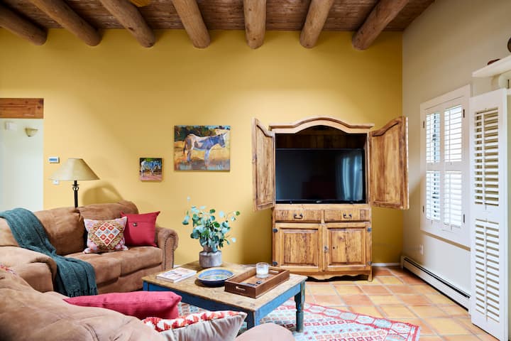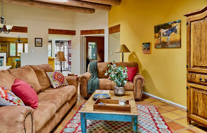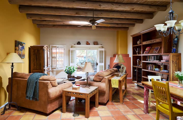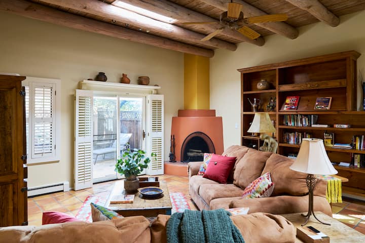 房源充满活力,配备书籍、音乐、艺术和厨房便利设施。 这里有大型圆形天花板、天窗、内置书柜、燃木Kiva壁炉和五彩缤纷的装饰。 客厅设有充足的座位,可在智能电视(包括Netflix )上观看您最喜爱的节目。 法式门通往后院,庭院完全封闭,配有另一个壁炉、桌椅,供您用餐、烧烤和种植。 这是享受圣菲美好天气的好去处–可能每年12个月!