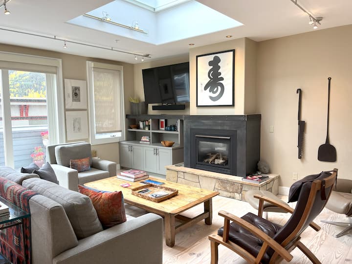 这间顶层公寓位于顶层(三楼),欢迎房客进入明亮、开放的起居区,宽敞的窗户环绕着周围的山峰。 宽敞的起居室设有豪华座椅、燃气壁炉和平板电视,是您在探险一天后放松身心的完美场所。
