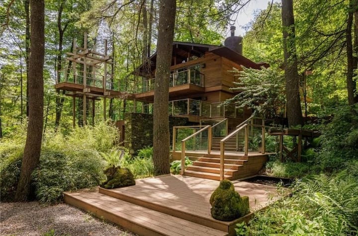山上带阳台、浴缸和壁炉的小屋