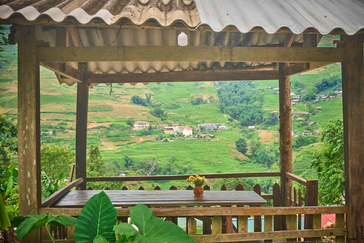 **FREE DAILY BREAKFAST** Experience the unique life atop the mountain with Rua House with clouds under your feet. A tranquil chalet for those who crave a soul shelter, with breathtaking scenery & modern comfort (with traditional furniture but modern toilet facilities & kitchen). It's 10 minutes from the crowded over-urbanized town, on the way to Ta Van village (a top visited place for tourists) This listing includes a private 1 group bedroom with a toilet outside for 4-6 people.