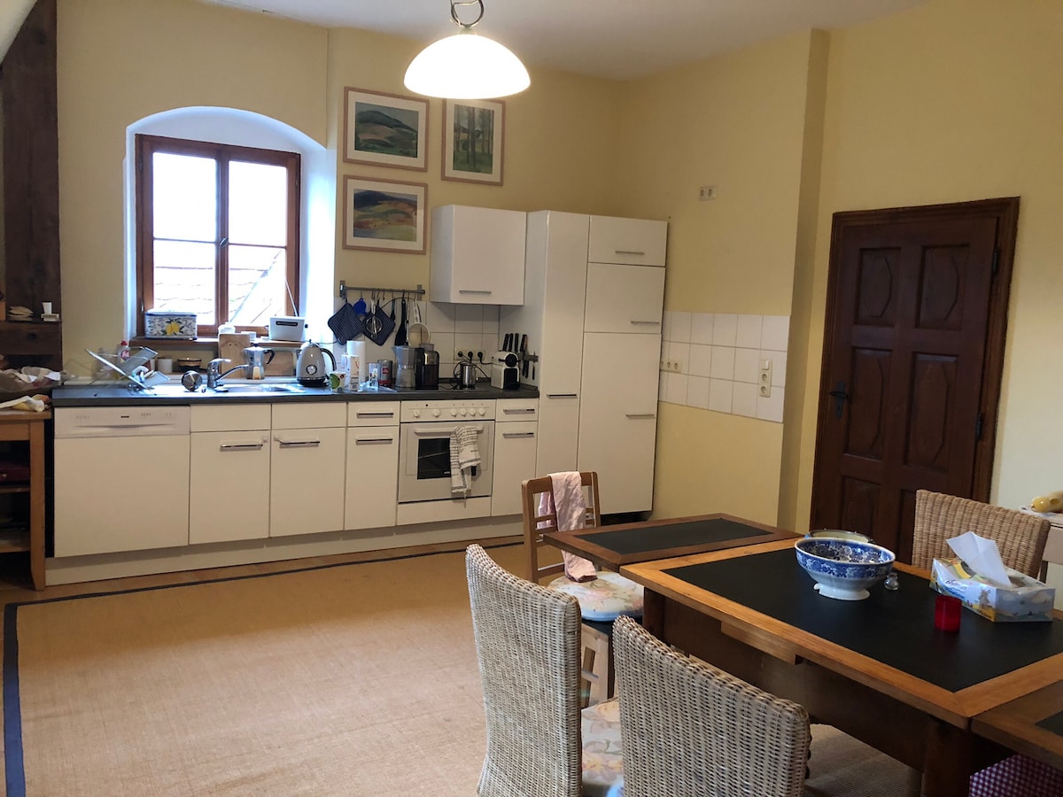 迷人的阁楼公寓,独特的家庭氛围。 根据原来的爱彼迎概念,我们出租我们的公寓,该公寓延伸到1863年诺戈蒂城堡( Neugoti Castle )的整个楼上。 这套公寓还私下使用了一段时间。 大型Werrasaal景观令人印象深刻,您可以在大餐桌或壁炉旁度过舒适的夜晚。 2间儿童房为儿童提供足够的空间。 玩具、拼图、CD播放器和书籍众多。
