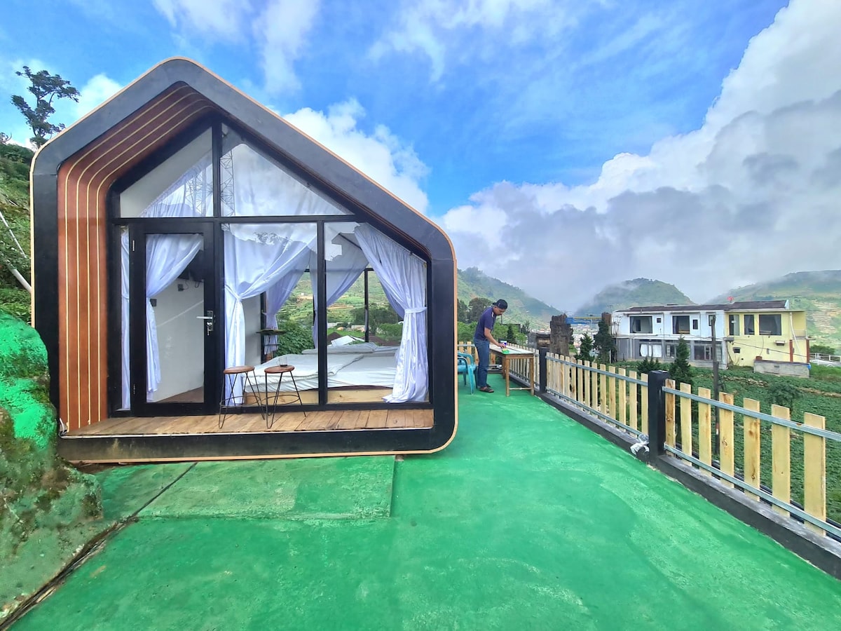 Penginapan tipe Cabin Mezanine, dengan fasilitas 1 Private Room, 2 bed Mezanine, 1 Kamar Mandi dan Kitchen Set beserta peralatan dapurnya. Penginapan ini berada di sekitar perkebunan kentang dengan view alam terbaik di Dataran Tinggi Dieng. Destinasi wisata terdekat juga sangat banyak, seperti pemandian air panas, Candi dsb.